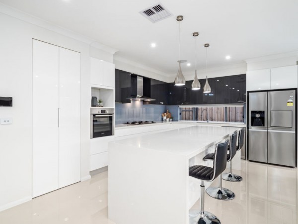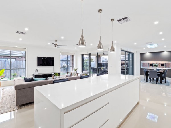 ~Modern open plan kitchen & dining with caesarstone island bench tops & walk-in pantry with gas cooking appliances