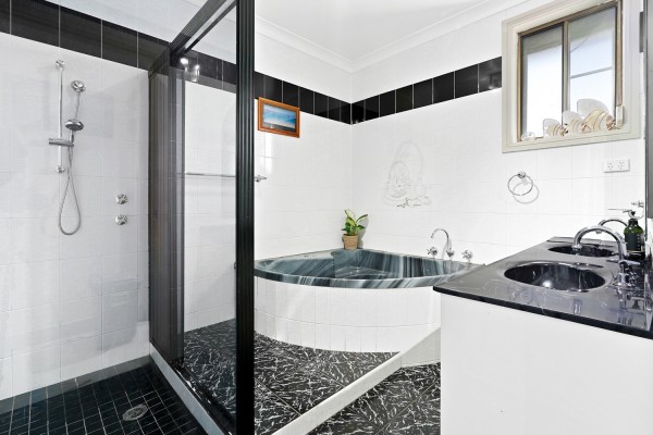 BATHROOM: Large main bathroom featuring floor to ceiling tiles, a corner spa bath and a double vanity plus separate toilet. There is also an ensuite bathroom to the main bedroom, plus an additional bathroom on the ground floor.