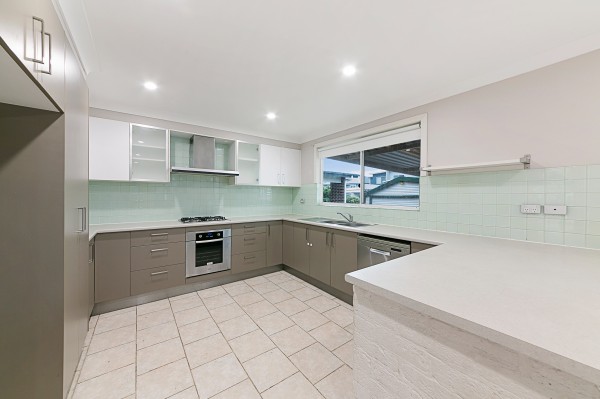 * Large modern kitchen with stone bench-tops, stainless gas cook-top, dishwasher and canopy range-hood