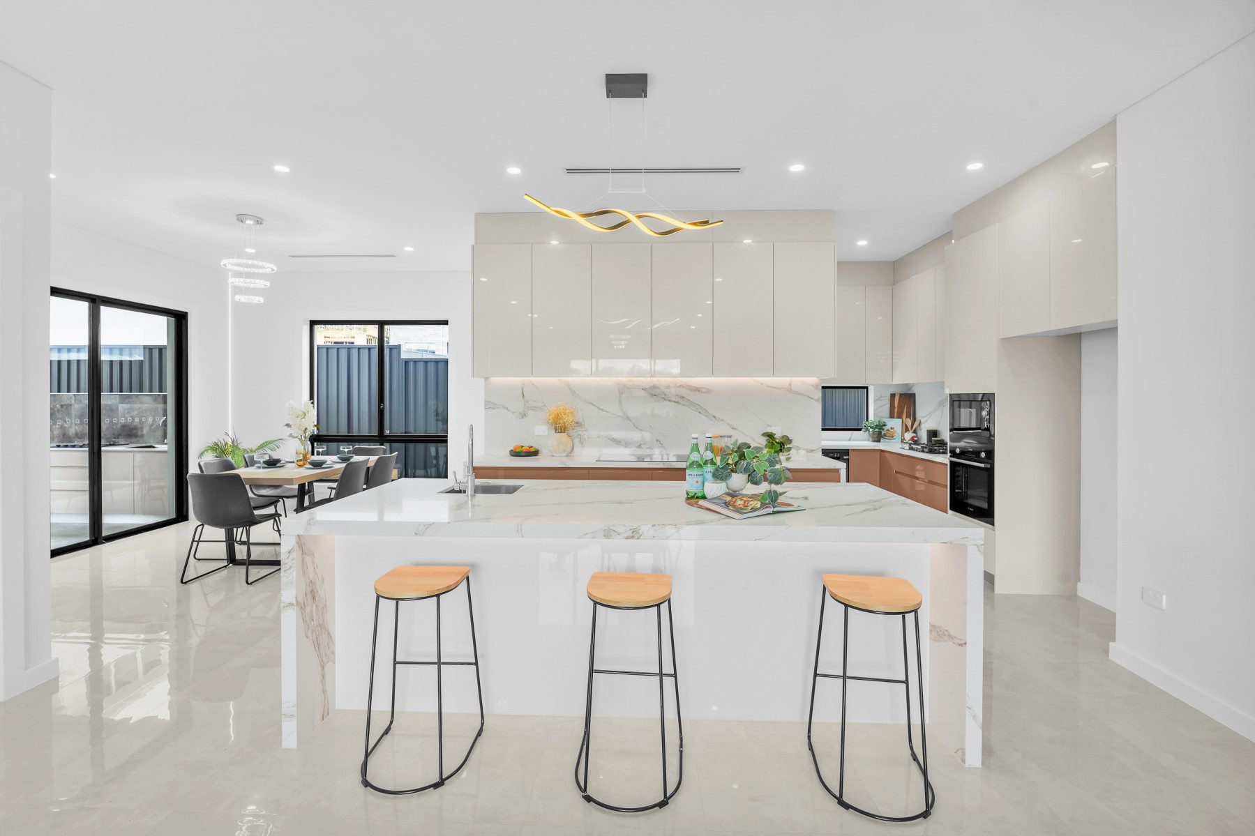 * 3 Sleek & stylish kitchen features large island bench with 60mm Caesarstone tops and waterfall edging, quality stainless steel appliances, gas cooking, dishwasher and built-in microwave oven with butlers pantry.