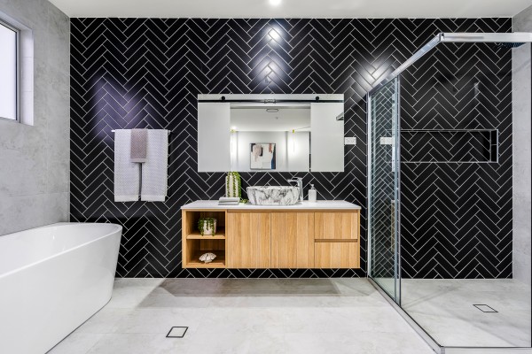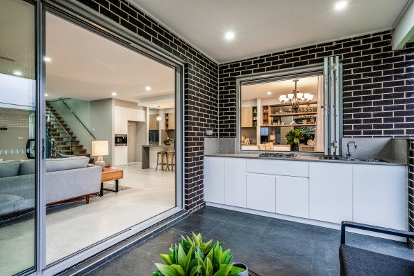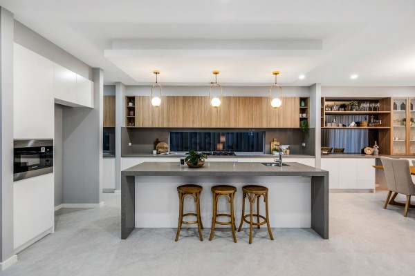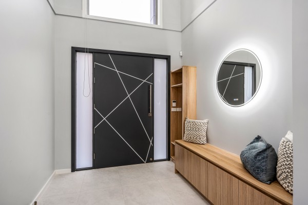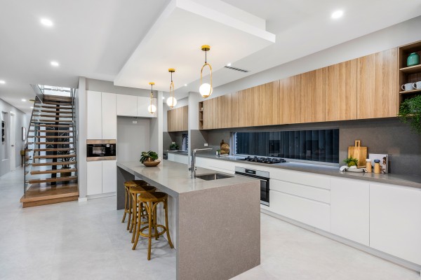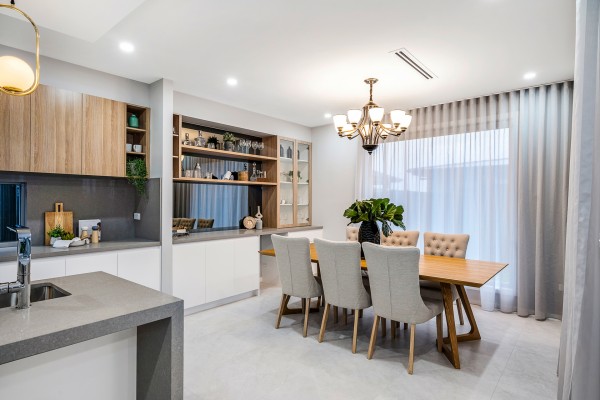 Customised joinery highlights the superior quality, enriched by breathtaking finishing touches, a mono stringer staircase framing a void entrance filled with natural light and a chandelier. Simply unmatched, the living and dining areas with a customer bar and bifold window for an alfresco kitchen have been designed to entertain the seamless, integrated indoor and outdoor space.