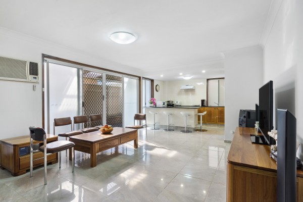 - Light filled open plan tiled living room with renovated kitchen including stone bench tops