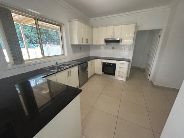 - White polyurethane kitchen with black granite benchtops and dishwasher
