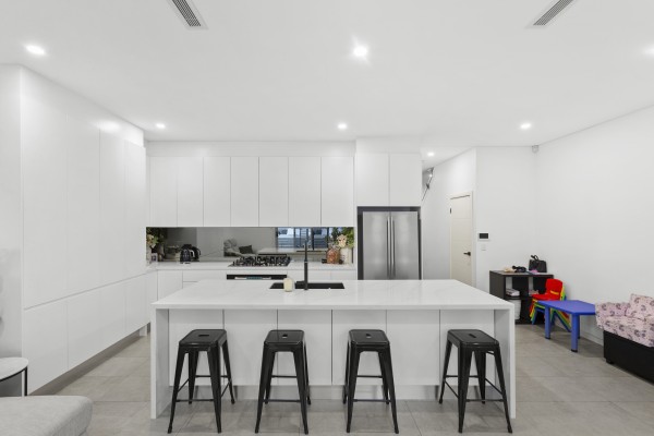 * Designer gas kitchen with thick stone bench tops