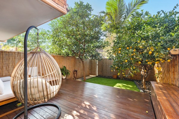 - Landscaped courtyard with deck and artificial turf