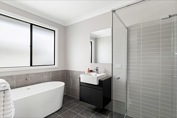 * Main bathroom with bathtub and floating vanity