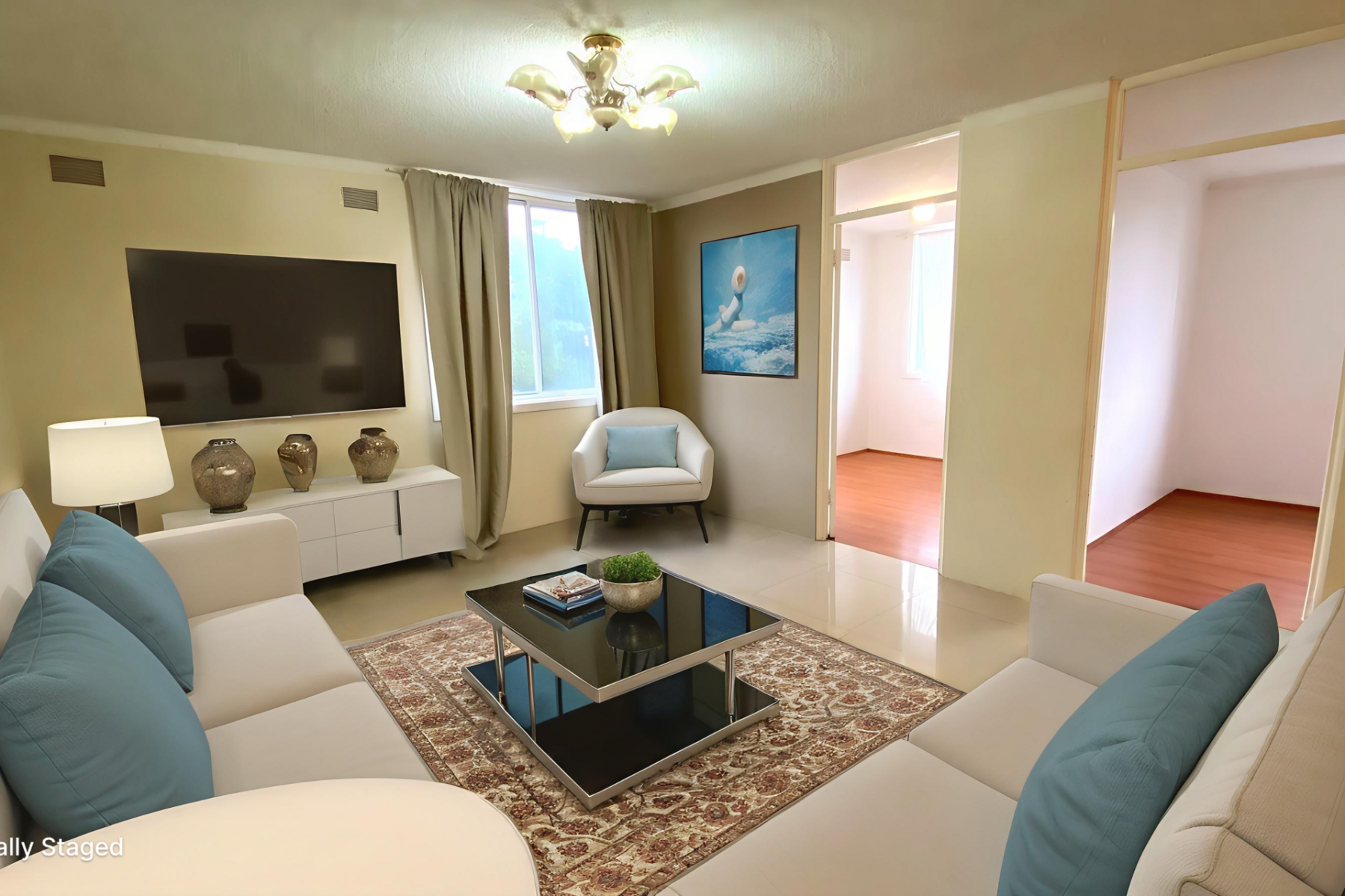 * Tiled living room and kitchen