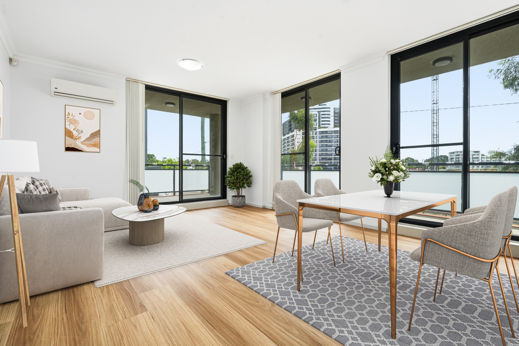 * Spacious living/dining area with split AC & large balcony