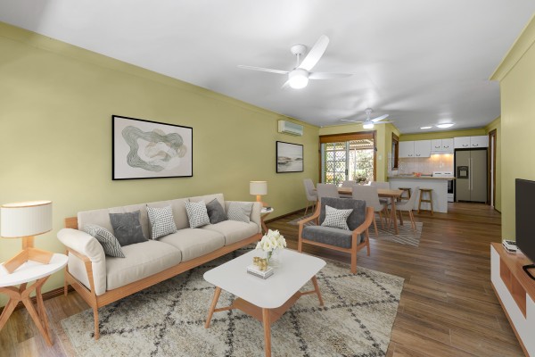+ Open plan living and dining area with laminate timber floors, split-system air-conditioner and ceiling fans