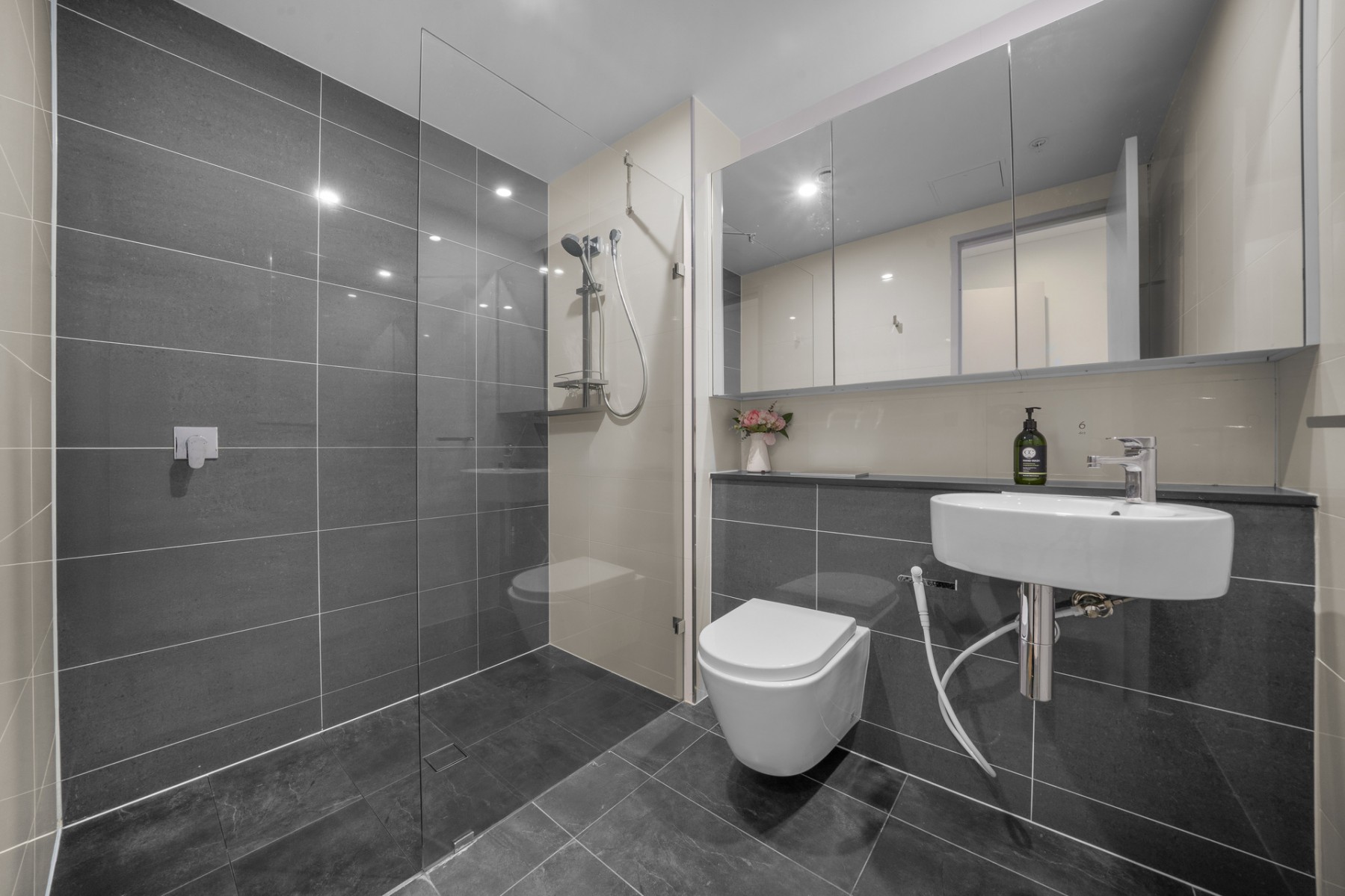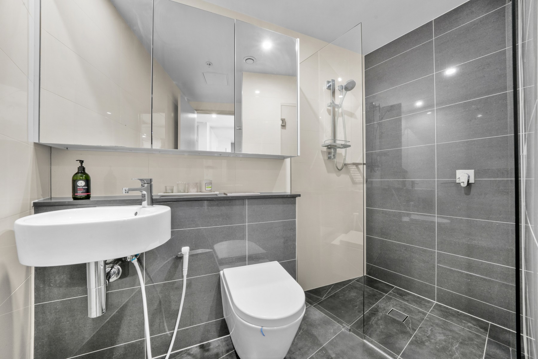 - 2 bright bedrooms with built-in robes, laminated timber look flooring, plus ensuite to main with frameless glass showers and floor-to-ceiling tiles