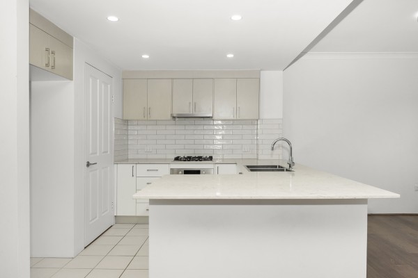 * Modern kitchen with stone benchtop and stainless steel appliances