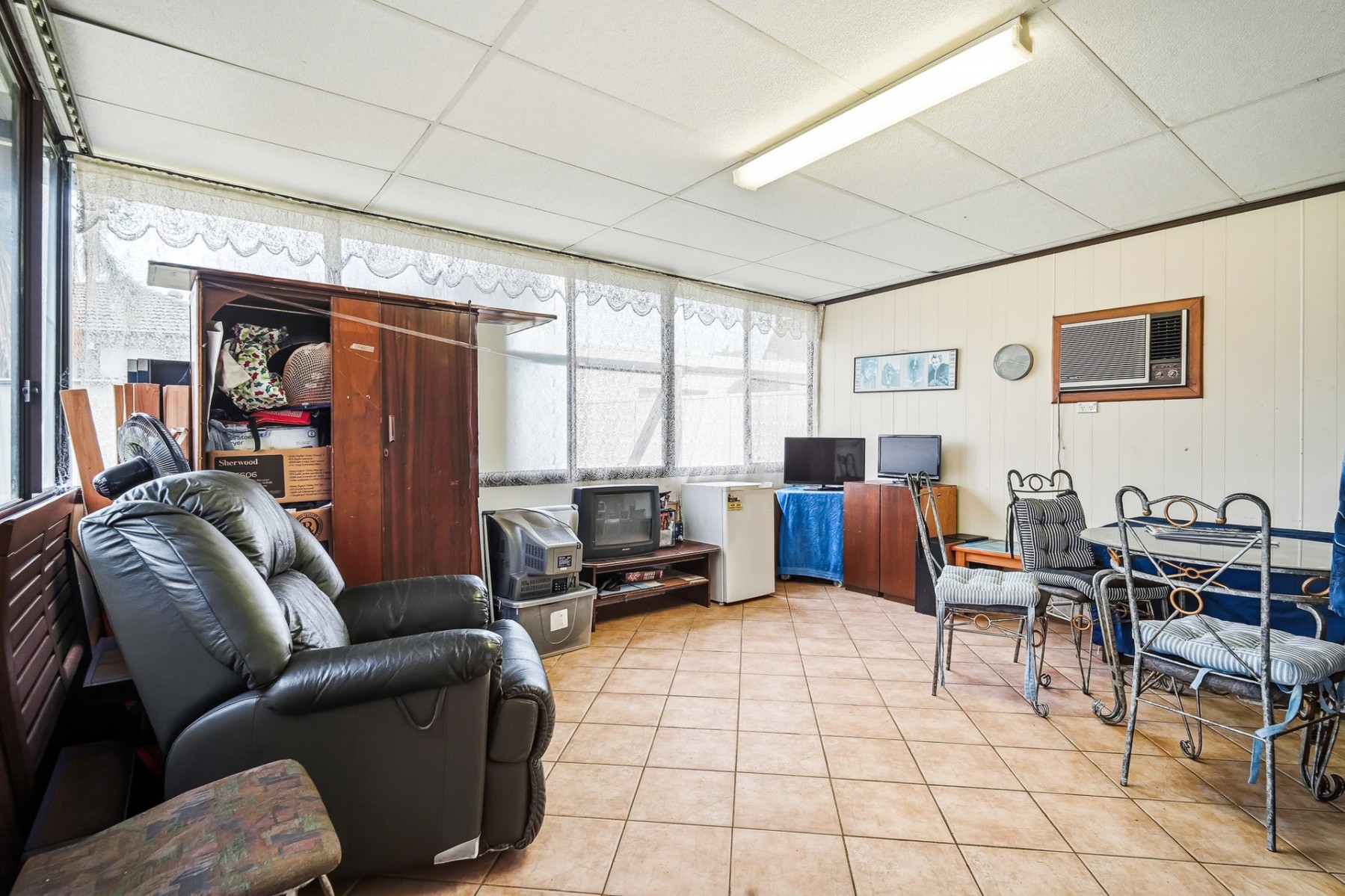 - Sunroom with wall air conditioner, providing extra living space perfect for relaxing or entertaining