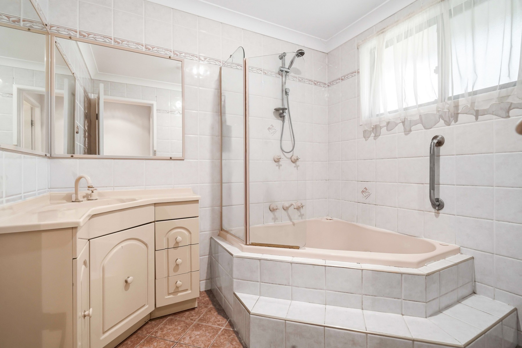 - Large bathroom tiled to the ceiling, featuring a combined corner bath and shower plus a separate toilet for added convenience