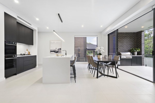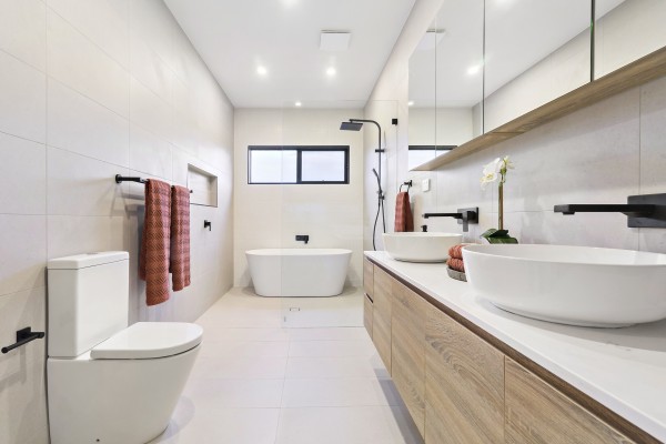 - Bathrooms with double vanities, frameless glass shower screens, and oversized shaving cabinets