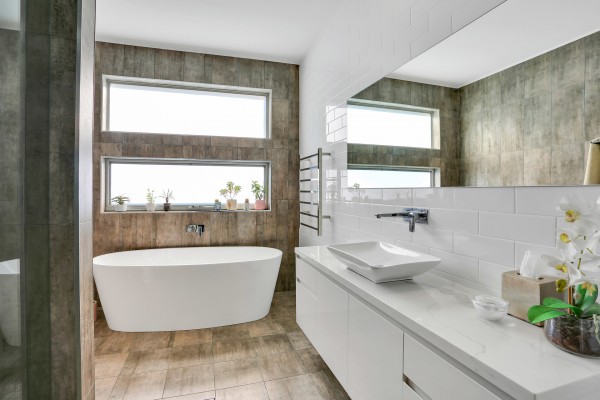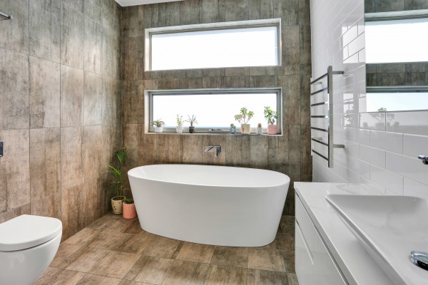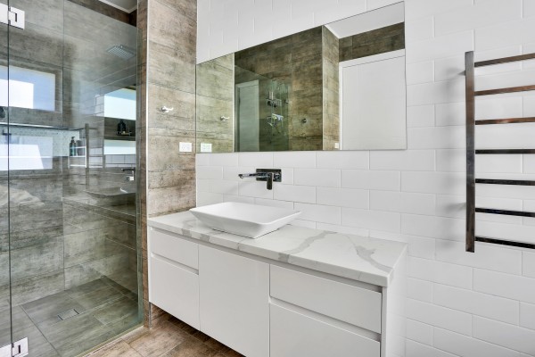 - Three modern bathrooms with wall cistern toilet, wall hung vanities & tiles up to ceiling
