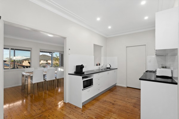 + Modern Kitchen equipped with gas appliances and stainless steel fittings for effortless cooking.