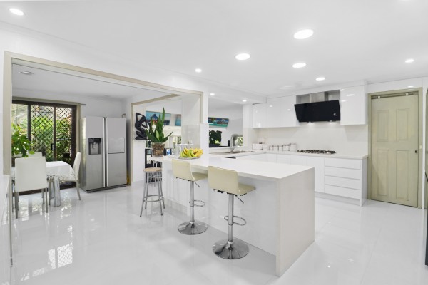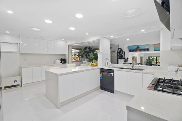 THE KITCHEN: Renovated ultra-modern kitchen featuring soft-close cabinetry, a gas cooktop, dishwasher and a breakfast bar. There is also an extensive amount of cupboards for extra storage.