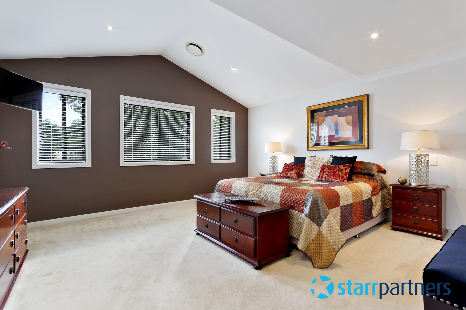 - The extra - large master bedroom cradled on the first floor comes adorned with high raked ceiling and is equipped with a delightful en-suite/spa and large walk in robes.