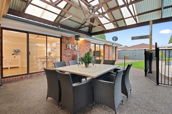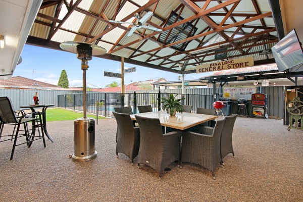 OUTDOORS: Huge gable roof entertaining area with a ceiling fan, overlooking the beautiful in-ground salt water pool- ideal for entertaining or for the kids to enjoy!