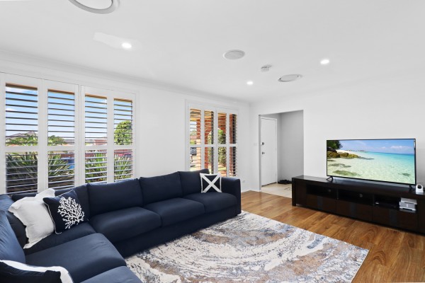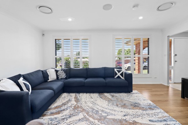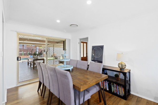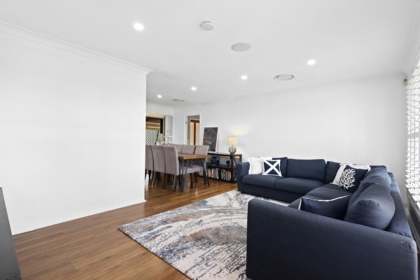 - Spacious L shaped lounge room with dining area with floating floorboards and sliding doors to undercover patio