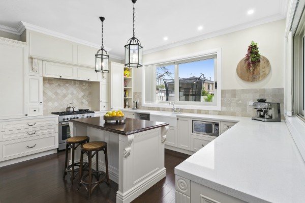 * Lavish gas kitchen with stone bench tops and immense pantry
