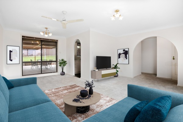 THE LIVING SPACE: Spacious L-shaped lounge and dining area at the front of the home. There is also an additional family/ meals area off the kitchen with a split system air conditioner. Both living areas feature a ceiling fan.