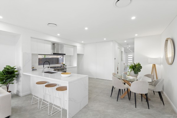 * Designer gas kitchen with thick stone bench tops