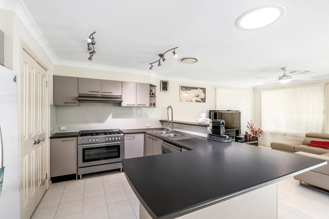 - Contemporary kitchen with large benchtops, gas cooking, and quality appliances