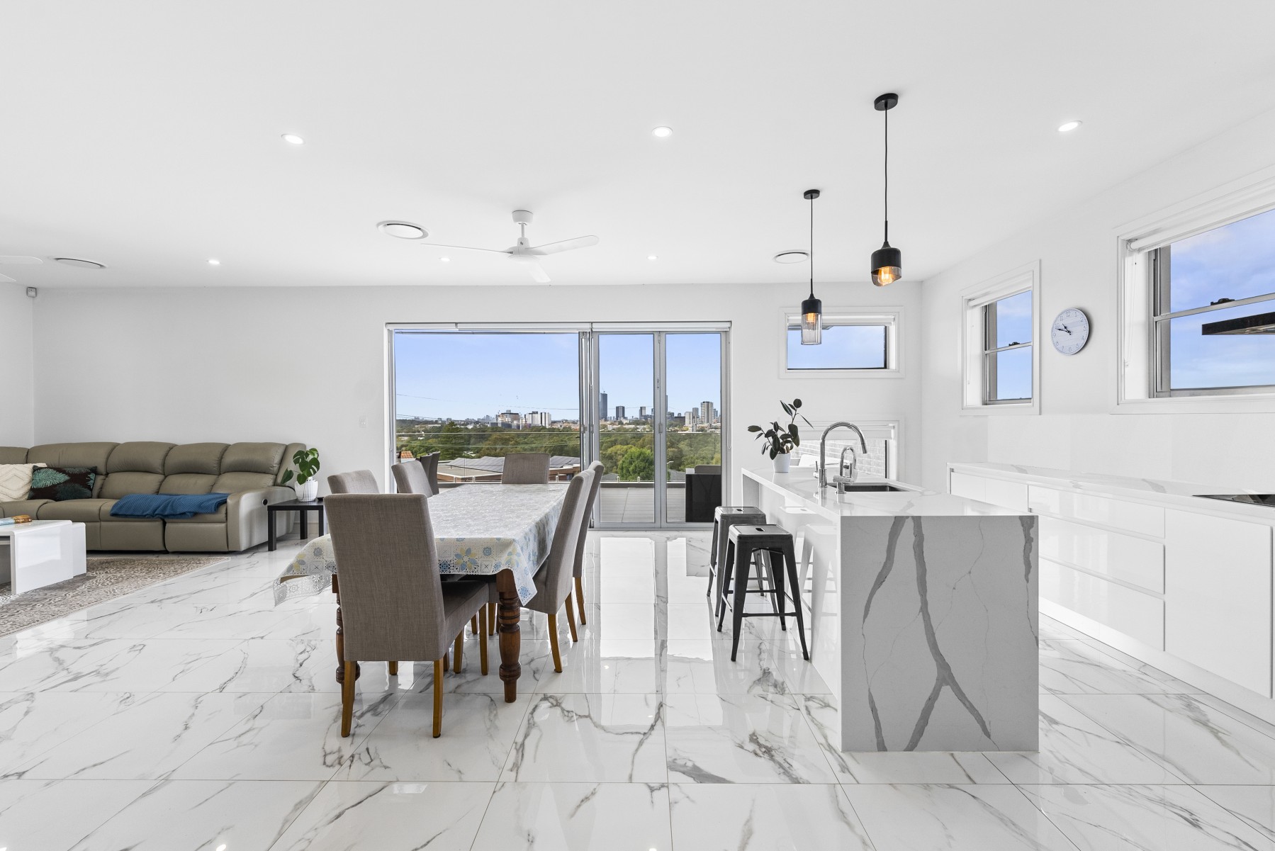 Uniquely designed across three levels and perfectly situated high up Constitution Hill, this architecturally designed home makes the most of its stunning location to deliver a class leading lifestyle. Boasting ducted air-conditioning and vacuum, chic marble tiled flooring, plantation shutters, alarm with online backup, CCTV with recording backup, plus 36 solar panels and battery, nothing has been left to chance in this luxurious residence. Enter to the sun-filled formal lounge which accesses a large east facing entertaining balcony where you and your guests can enjoy exceptional district views from the high set position. A separate spacious family room makes entertaining a breeze with a designer kitchen inclusive of thick marbled stone bench tops, island sink and breakfast bar, stainless steel appliances including dishwasher, plus walk-in pantry, all accessing a second covered courtyard with automated blinds for all weather entertaining surrounded by landscaped, low-maintenance gardens with custom security lighting. There are three bedrooms on this level, all with built-in robes including an oversized master suite accessing an ensuite bathroom.