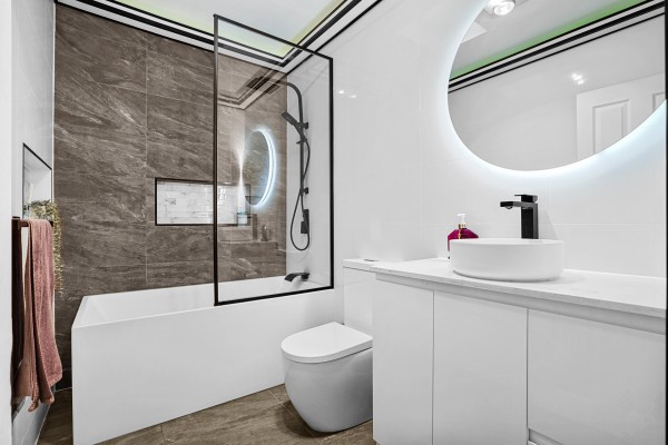 - Quality renovated main bathroom with freestanding bath tub, marble bench tops, black fixtures, skylight, LED mirror and coloured LED lighting, with floor to ceiling tiles