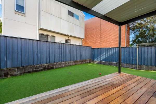 ~ Artificial grass is installed in the backyard for convenience and reduced upkeep.