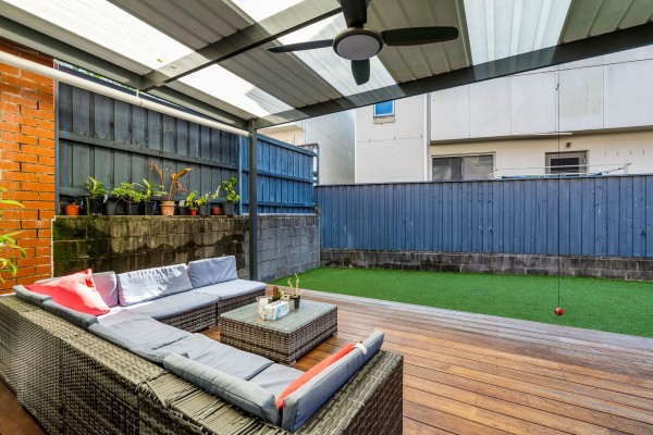 ~ The pergola features a clear roof to let in natural light and includes a ceiling fan, complemented by timber decking for outdoor enjoyment and family gatherings.