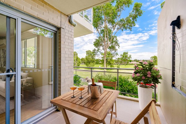 ~ Living room flowing into the oversized balcony with uninterrupted views to the Oval, perfect for entertaining.