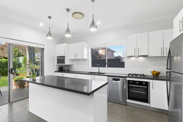 * Chic gas kitchen with thick stone bench tops