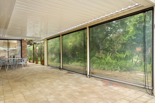 Private rear yard with outdoor vergola entertaining area surrounded by mature landscaping and overlooking the saltwater, solar heated, in-ground swimming pool