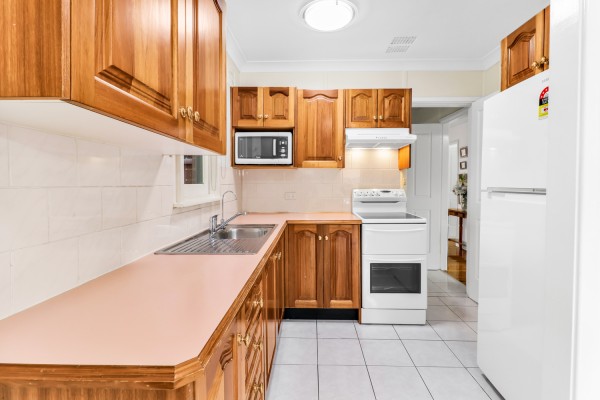 THE KITCHEN: Well presented timber kitchen offering an electric cooktop and plenty of bench and cupboard space