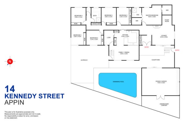 6 bedrooms, all with built ins, including the Master Bedroom which has its own His & Hers Walk in Robes and of course ensuite. The separated front lounge with study nook opens onto the courtyard or in the winter months enjoys the warmth of the glowing fireplace. The ducted air conditioning provides year round comfort and the north facing roof holds just over 50 solar panels.