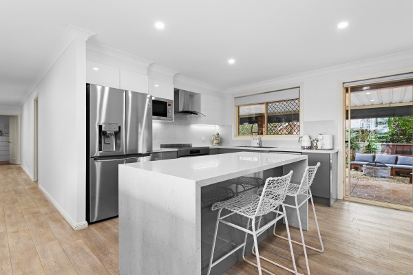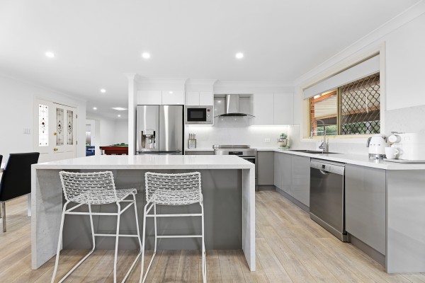40mm silestone benchtops, waterfall island bench with breakfast bar, bosch