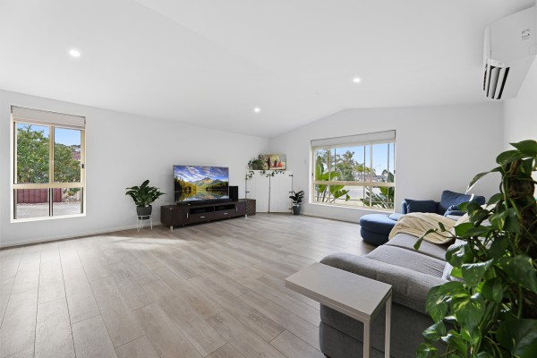- Light filled oversized lounge room with Fujitsu split system air-conditioner,
