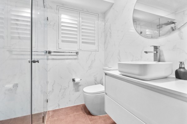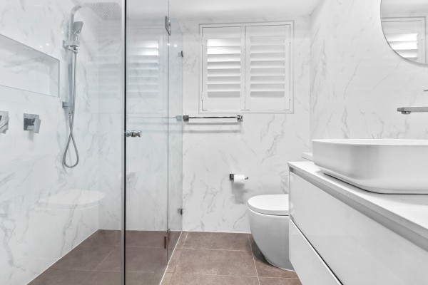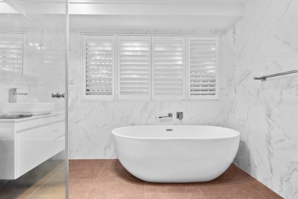 - Quality renovated main bathroom with floor to ceiling tiles, free standing bathtub, large shower, marble bench tops and plantation shutters