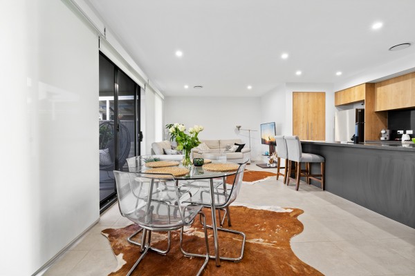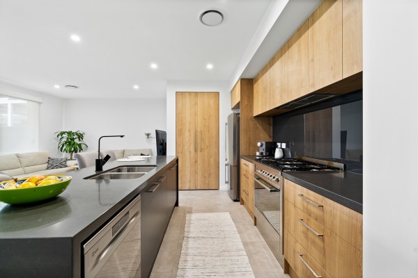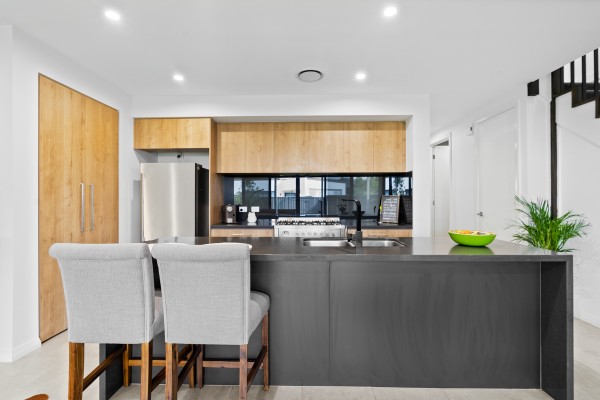 Downstairs, a fully fitted gourmet kitchen offers gas cooking, stainless steel appliances, dishwasher, and a breakfast bar. All connecting to a great size open-plan lounge and dining area that flows into the outdoor entertaining area.