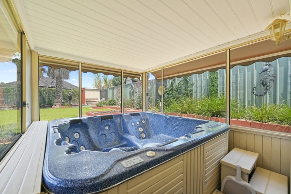 - Oversized sunroom with downlights plus built-in reading nook/storage bench as well as an enclosed spa room