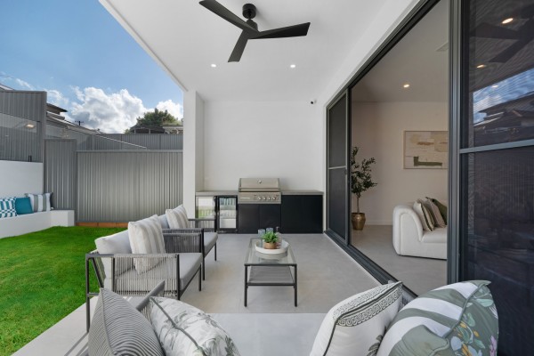 The heart of the home is the open-plan living area, where family and friends can come together. From here, step outside into your covered entertaining space, where countless memories will be made, whether it's a quiet dinner or a lively weekend barbecue.
