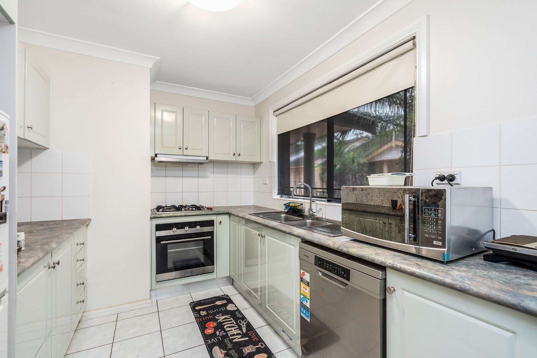 ~ Modern kitchen with stone benchtops, gas cooking, and dishwasher