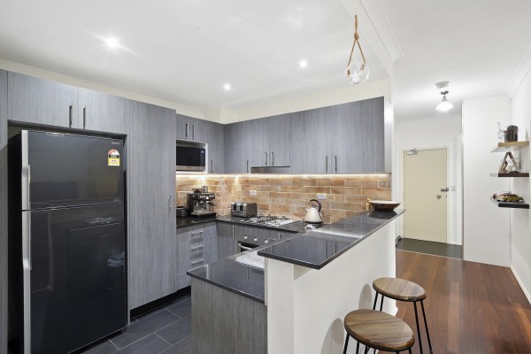 * Designer gas kitchen with stone benchtops and breakfast bar