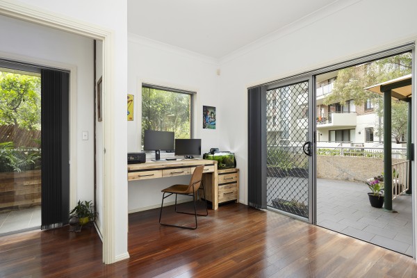 This exceptional three-bedroom security unit features a unique and stylish design, complete with leafy green views and premium hardwood flooring throughout.