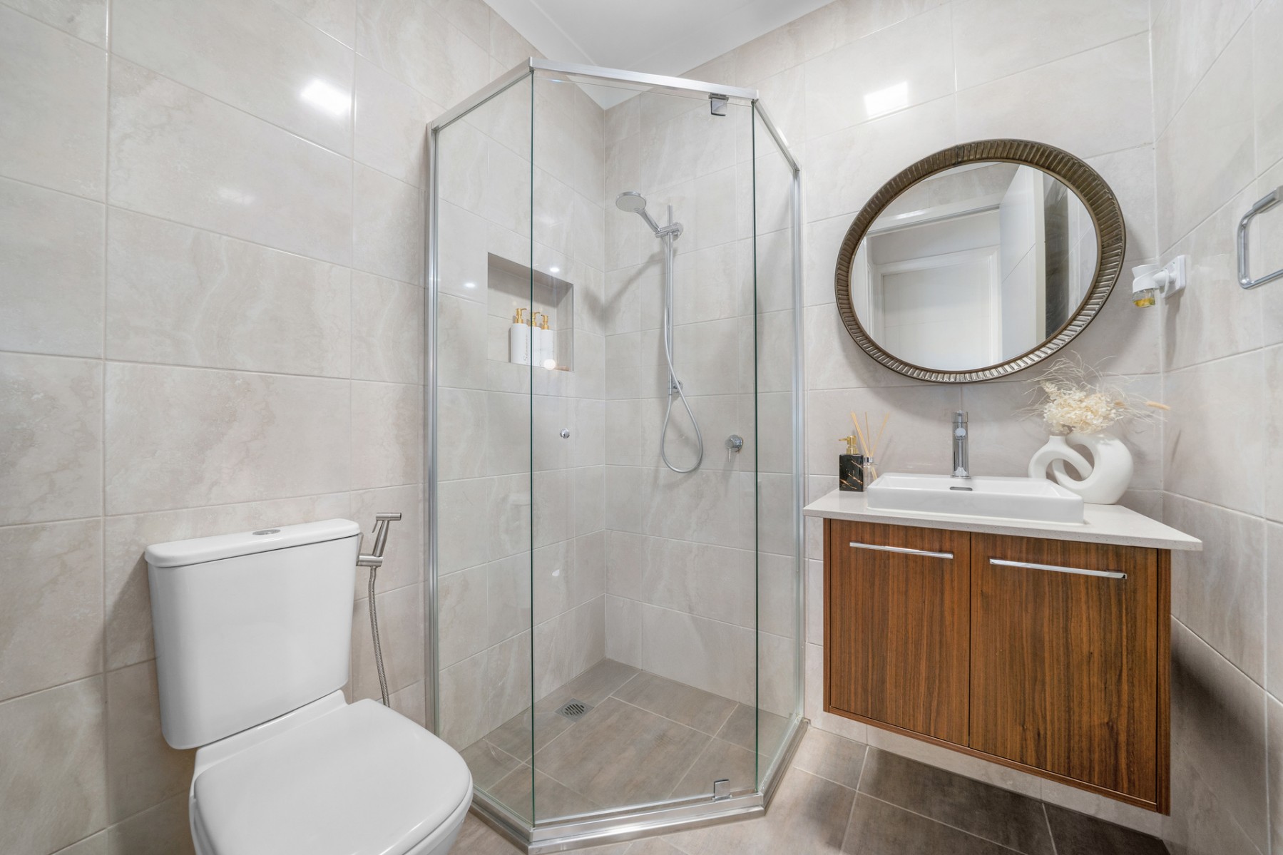 - Stylish bathrooms with full-height tiling, including a family bathroom upstairs with ensuite access, a separate toilet, and downstairs powder room with shower
