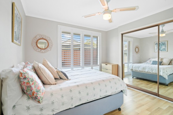 - Main bedroom includes a large mirrored built in wardrobe, ceiling fan and laminated flooring
