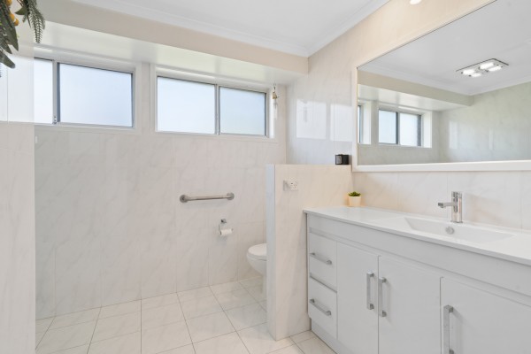 - Well-appointed main bathroom features a contemporary design with floor to ceiling tiles, spacious shower, heated towel rail and a large single vanity with a stone benchtop