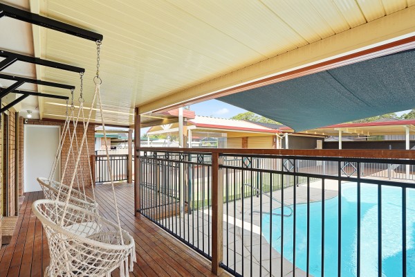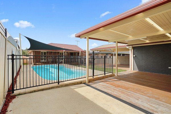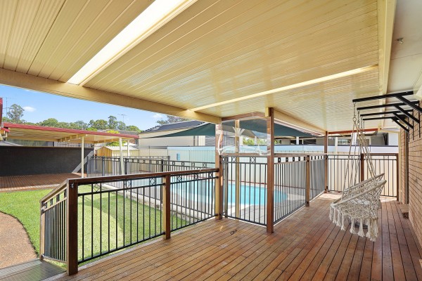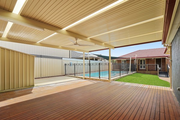 - External laundry with utility sink and undercover timber decking overlooking sparkling in-ground pool